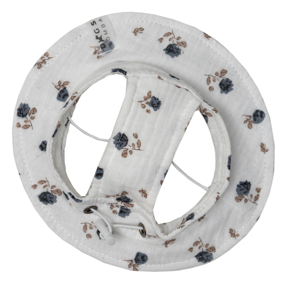 Панама Dogs Bomba S-123 — летний головной убор из муслина в исполнении с принтом цветы. Защищает глаза и мордочку собаки от прямого солнца, не парит голову благодаря натуральным материалам, держится на резинке-фиксаторе под подбородком.