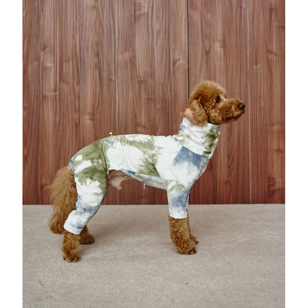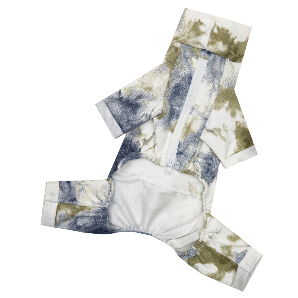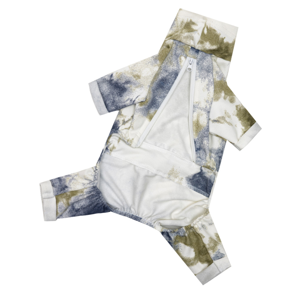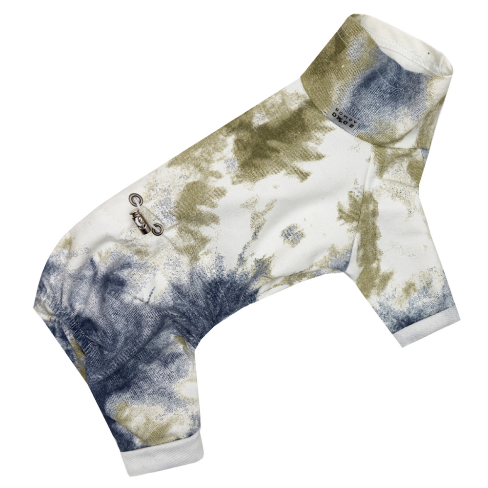 Тонкий стретч-трикотаж с декоративным принтом тай-дай. Кофта и штаны свободного кроя с эластичным поясом и манжетами — собаке легко двигаться, ничего не давит. Материал не натирает кожу даже при длительном ношении.