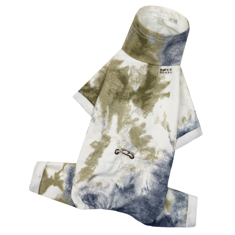 Костюм Dogs Bomba D-253 — летний двухкомпонентный комплект из тонкого трикотажа с модным принтом тай-дай в оттенках хаки. Материал не сковывает движений и подходит для тёплых весенних и летних прогулок, а также для дома в прохладном помещении.