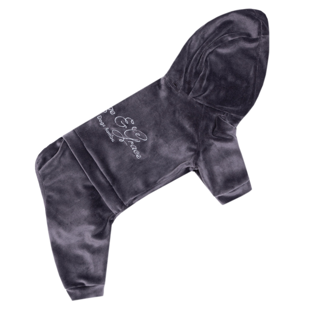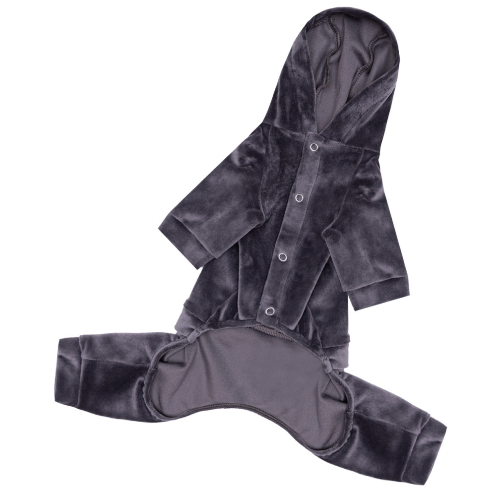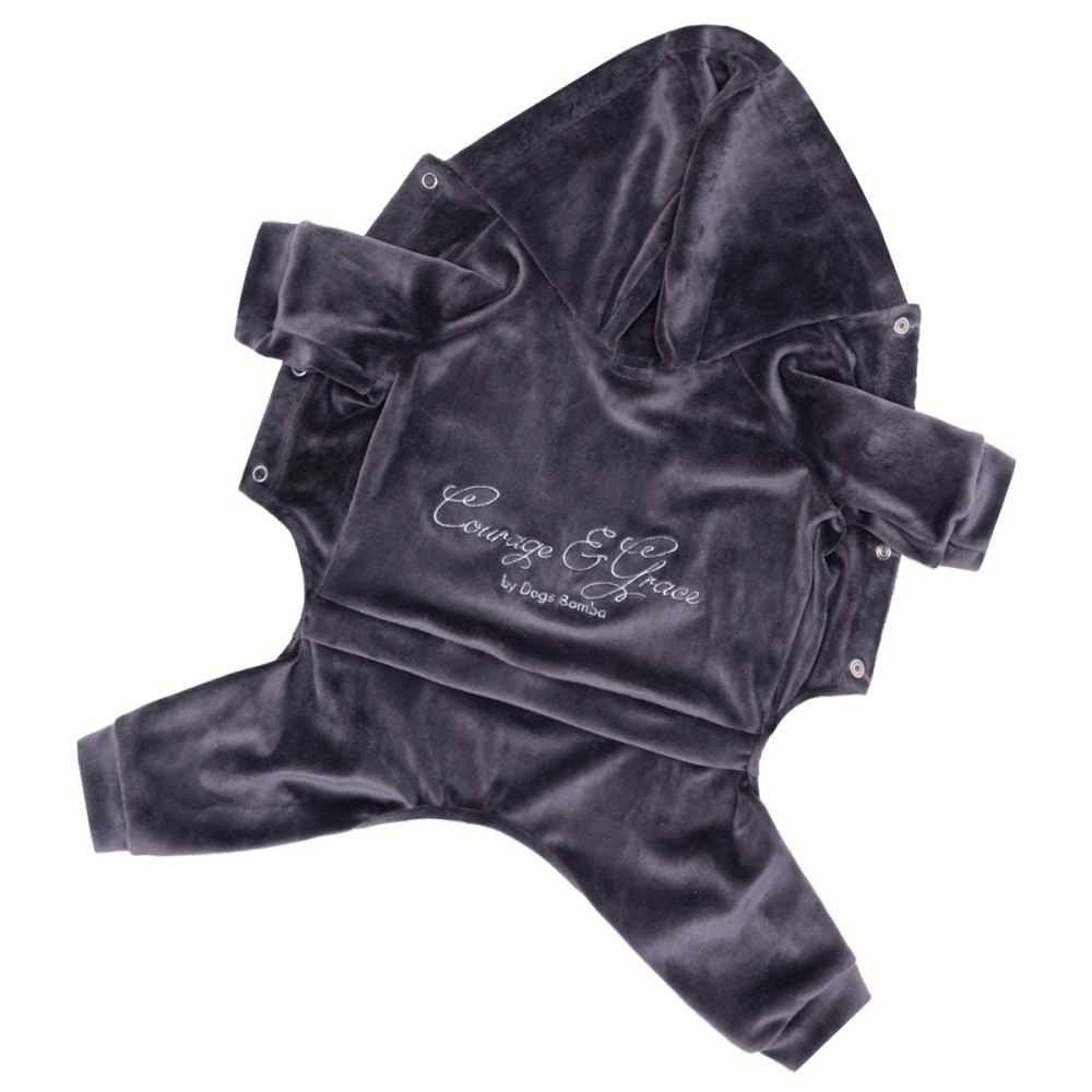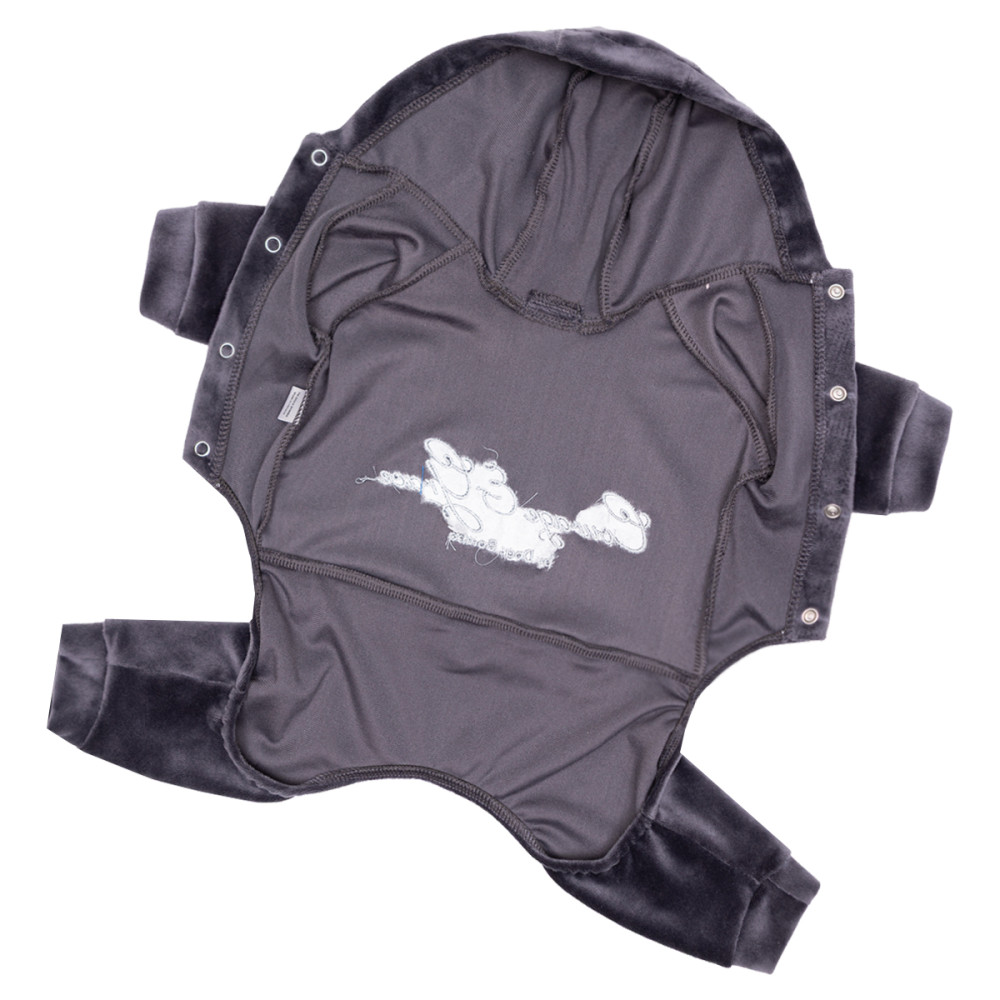 Костюм велюровый Кураж графит D-241 — это стильная и удобная одежда для прогулок, обеспечивающая комфорт и тепло. Модель выполнена из мягкого велюра, приятного на ощупь, имеет удобный крой и глубокий серый цвет. На спинке изделие украшено брендированной вышивкой, а наличие капюшона придает образу завершенность. Отличный вариант для дома, прохладной весны или сухой осени. Зимой рекомендуем использовать как дополнительный слой под зимние комбинезоны для собак.