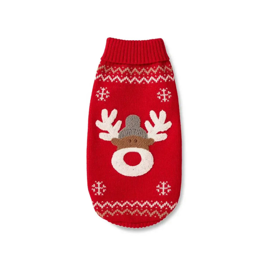 Wolters Rudi — вязаный свитер для собак в ярко-красном цвете с праздничным мотивом оленя. Мягкий трикотаж сохраняет тепло, высокий ворот защищает шею, эластичная вязка не стесняет движения на прогулке и дома.