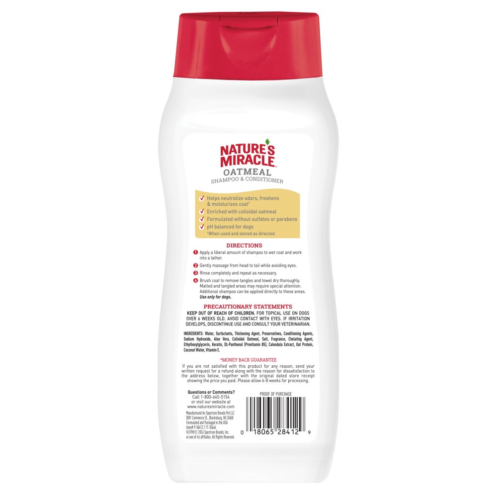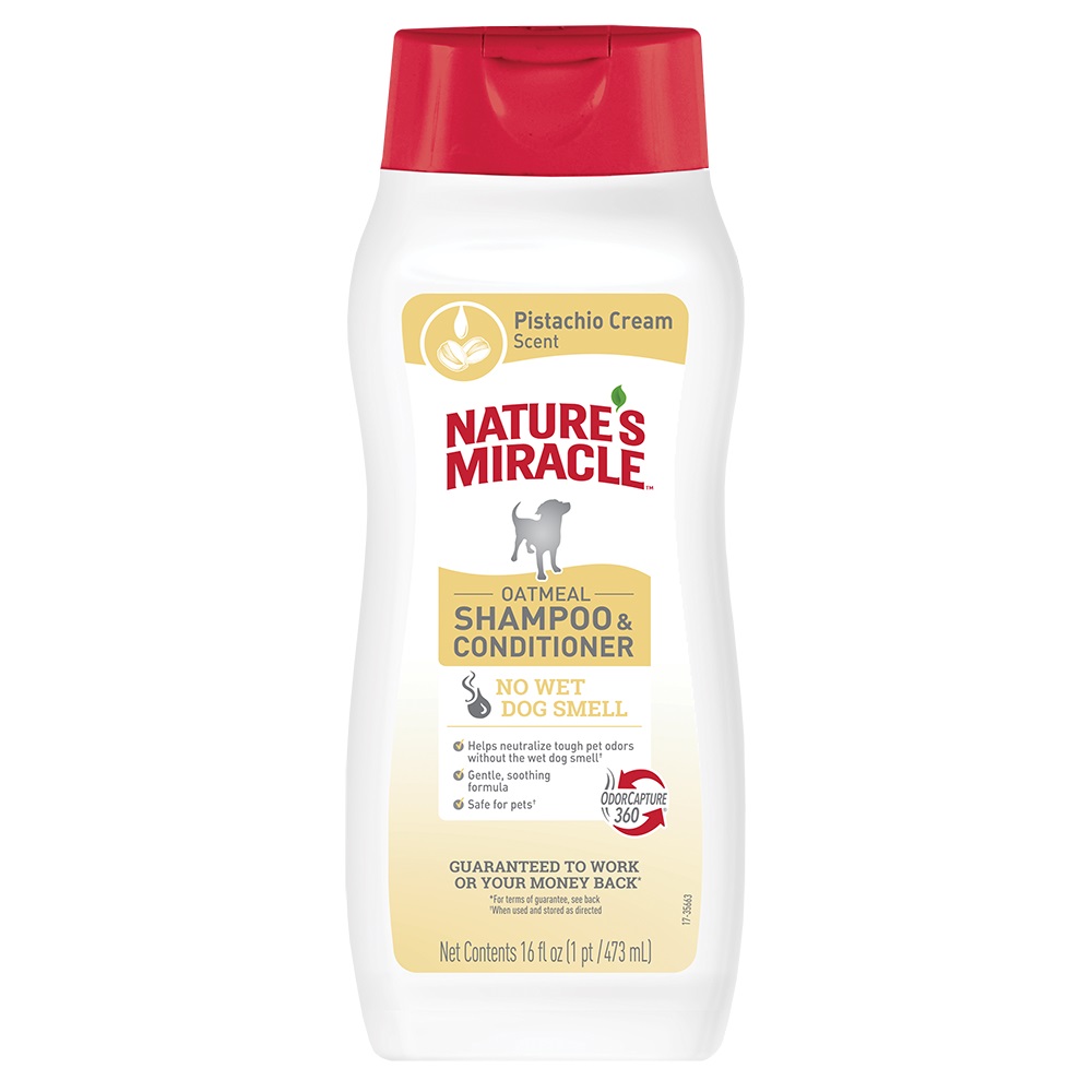 Шампунь-кондиционер 8in1 Nature's Miracle — это средство 2-в-1 для ухода за шерстью и кожей собак. Его формула с коллоидами овса, пантенолом и алоэ вера разработана для эффективного очищения, нейтрализации запахов и успокоения раздраженной кожи, оставляя приятный аромат овсяного молока и фисташки.