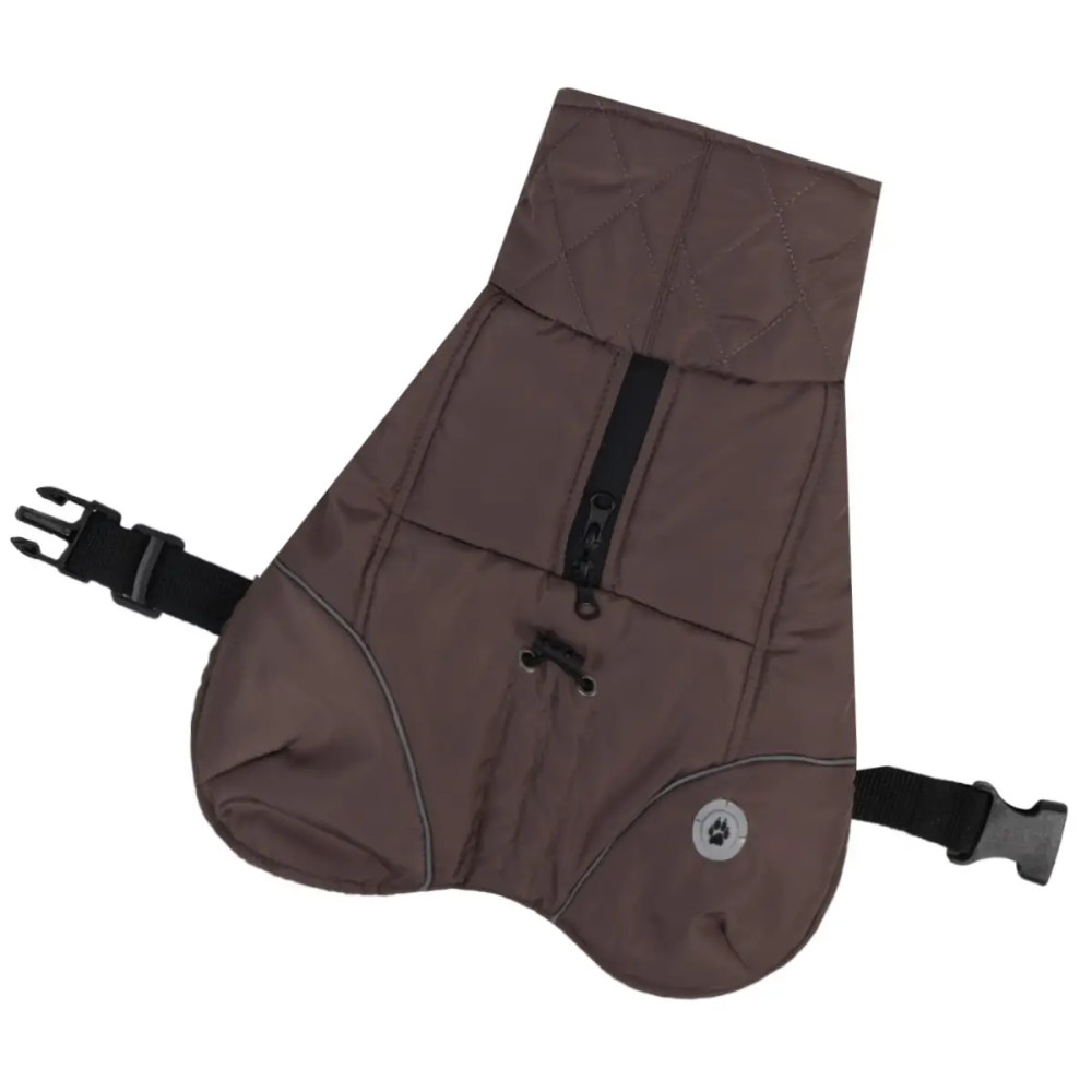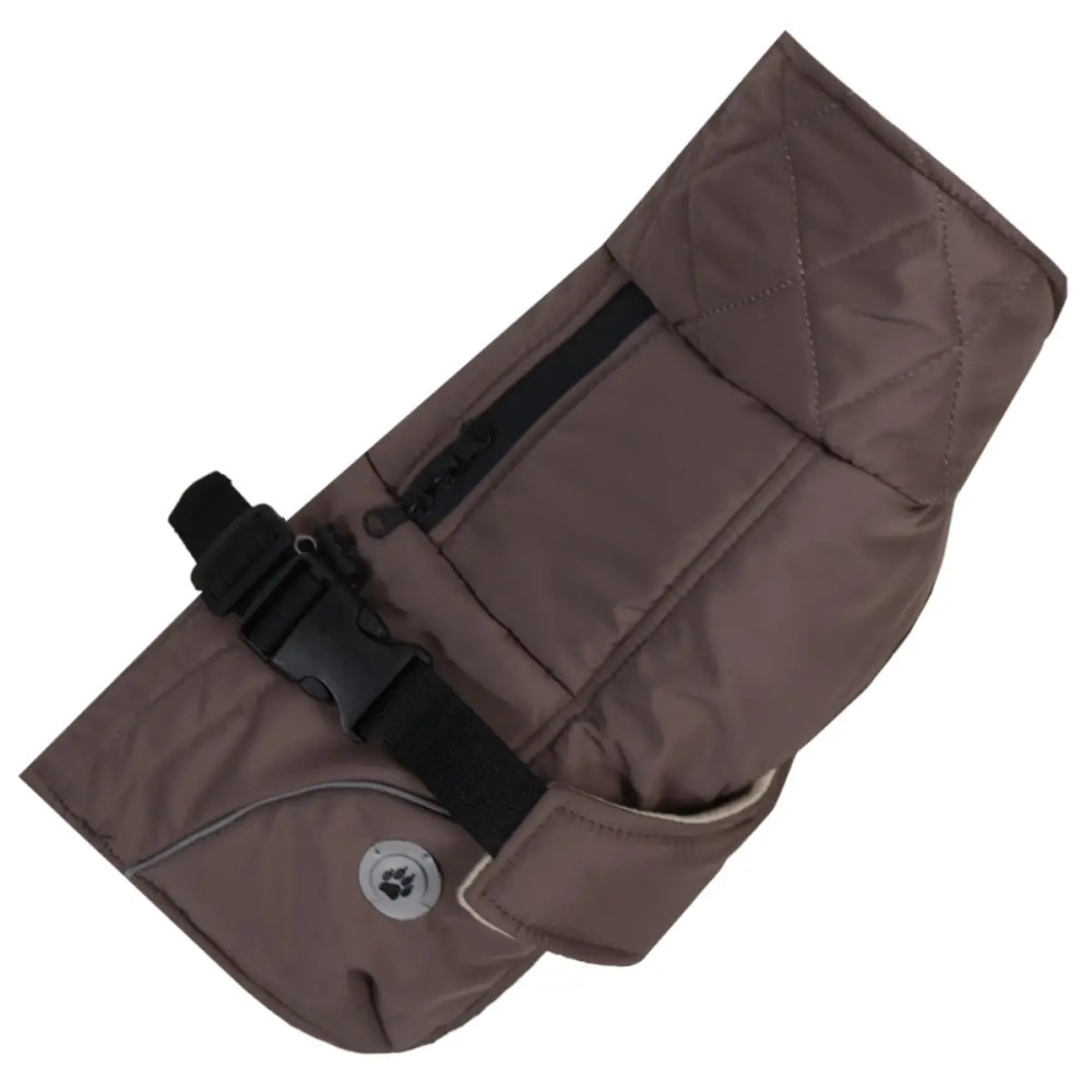 Верх изделия выполнен из влагозащитной плащёвки, утеплитель синтепон сохраняет тепло, а мягкая флисовая подкладка обеспечивает уют. Модель застёгивается поясом на спинке, есть регулировки объёма груди и длины спины. На спине предусмотрено отверстие с молнией для поводка от шлейки. Дополнительную фиксацию обеспечивают резиночки на задних лапах, а высокий воротник можно отвернуть или использовать для защиты ушек.