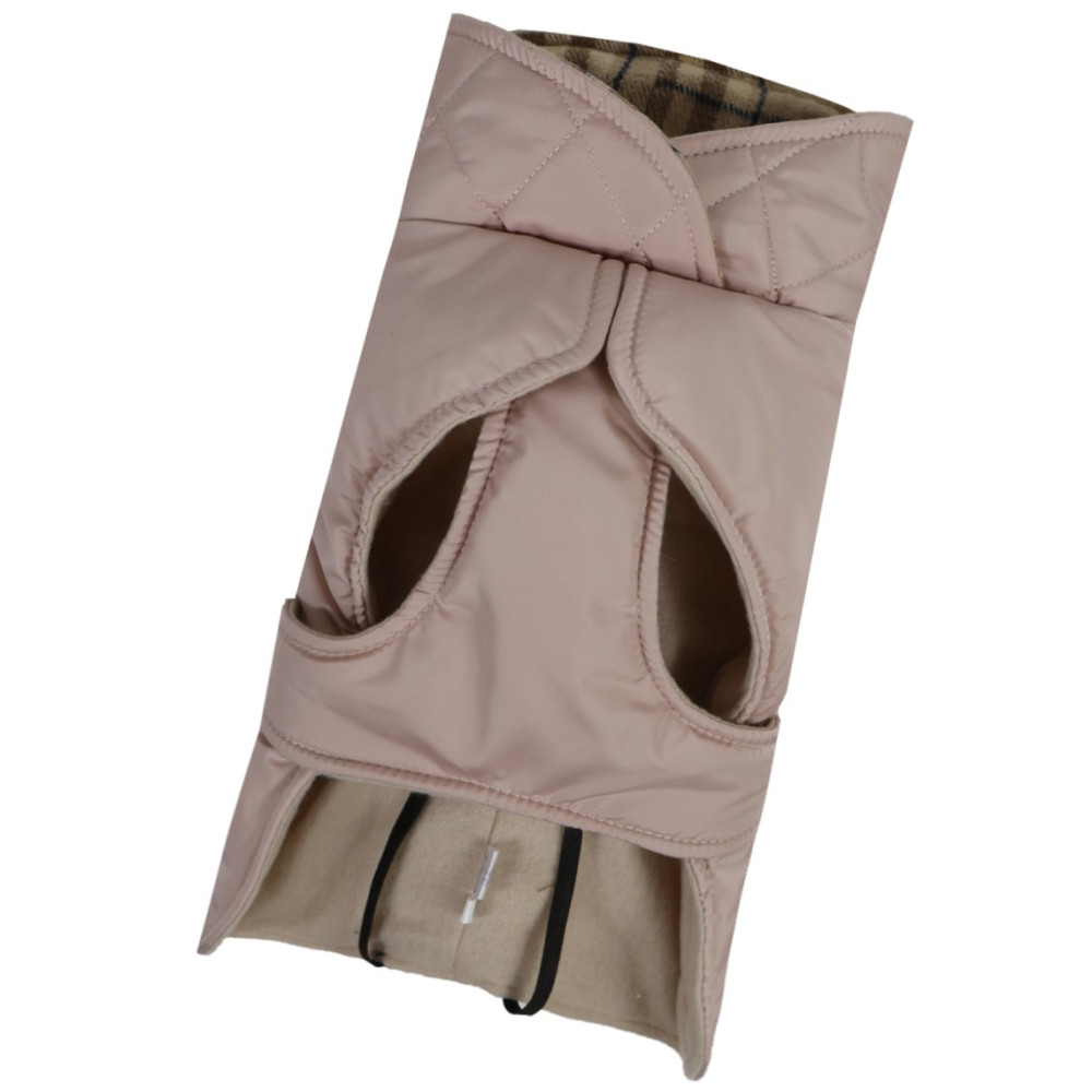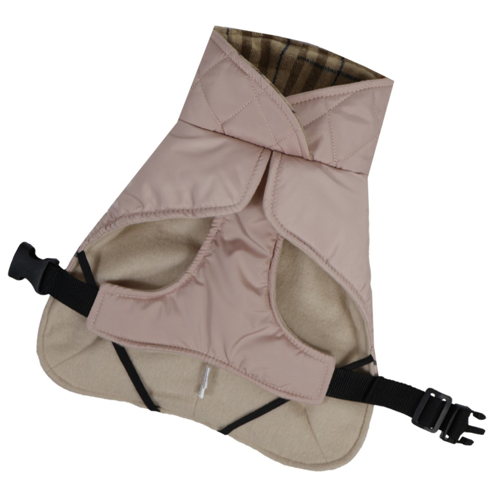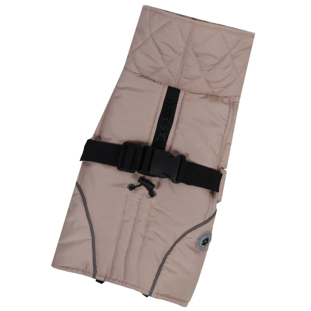 Жилет попона фиксируется с помощью удобного пояса на спинке, что позволяет быстро собрать собаку на прогулку. Модель оснащена регуляторами обхвата груди и длины спинки, поэтому адаптируется под анатомические особенности животного. Высокий воротник надежно закрывает ушки от ветра, а при необходимости его можно легко подвернуть.