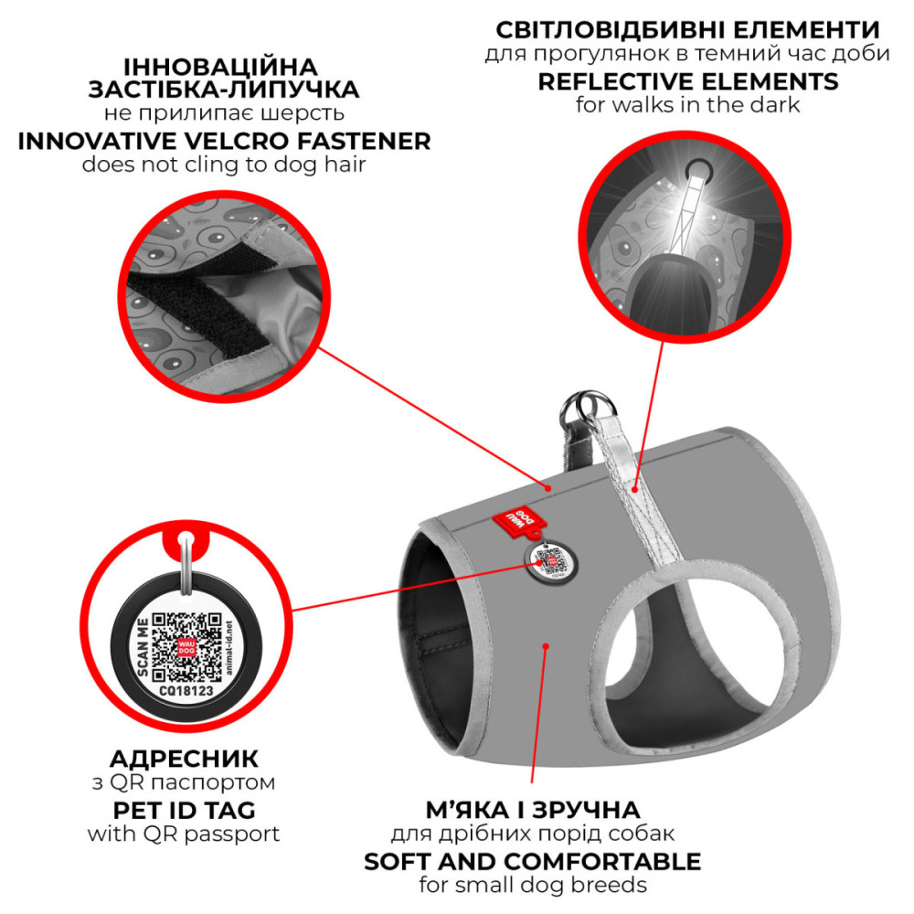 Ця модель розроблена для максимальної зручності дрібних порід. Вона оснащена інноваційною застібкою-липучкою, яка надійно тримає, але завдяки спеціальній структурі не чіпляється за шерсть. Це гарантує швидке одягання без дискомфорту. Безпеку вашого героя гарантують "розумний" адресник з QR-паспортом та світловідбивні елементи.