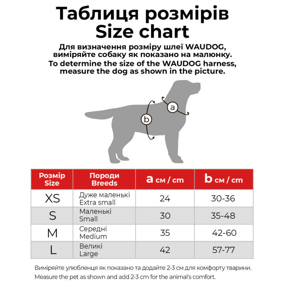 Для визначення розміру виміряйте обхват шиї (A) та грудей (B) собаки. У таблиці наведено параметри виробу та орієнтовний список порід.