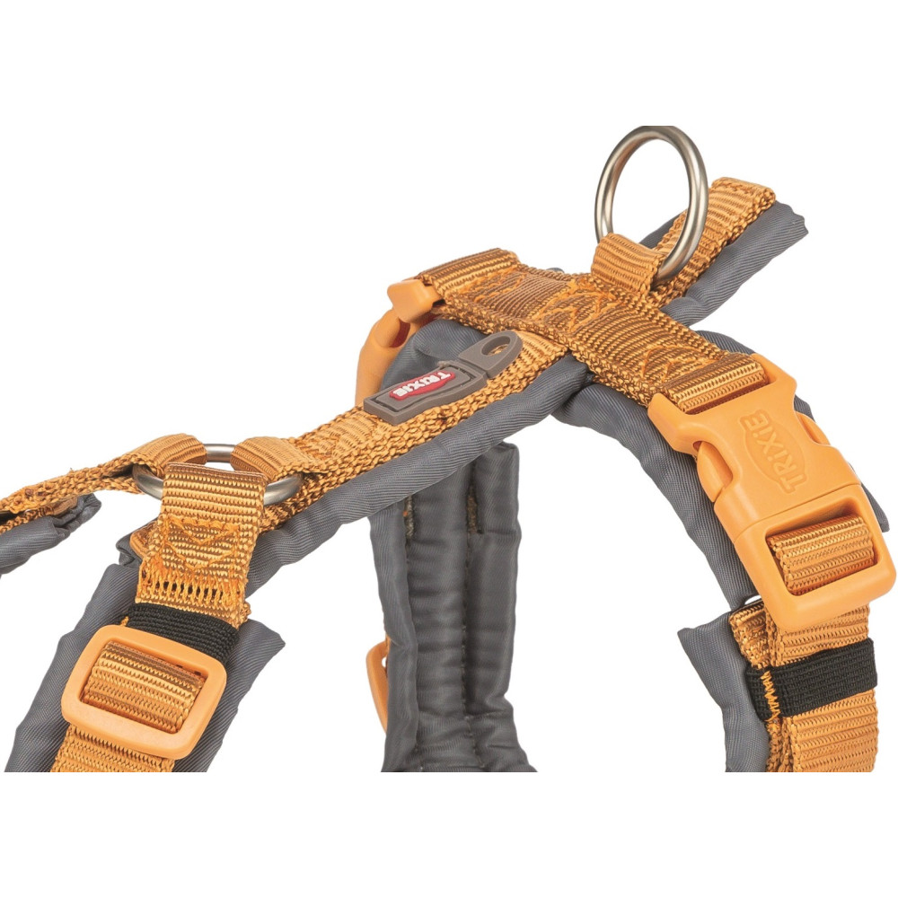 Продумана конструкція шлеї забезпечує оптимальний розподіл навантаження. Наявність додаткового кільця для повідця в області грудей дозволяє використовувати її для корекції поведінки та навчання, запобігаючи тягненню на прогулянці.Переваги трекінгової шлеї Trixie Premium: