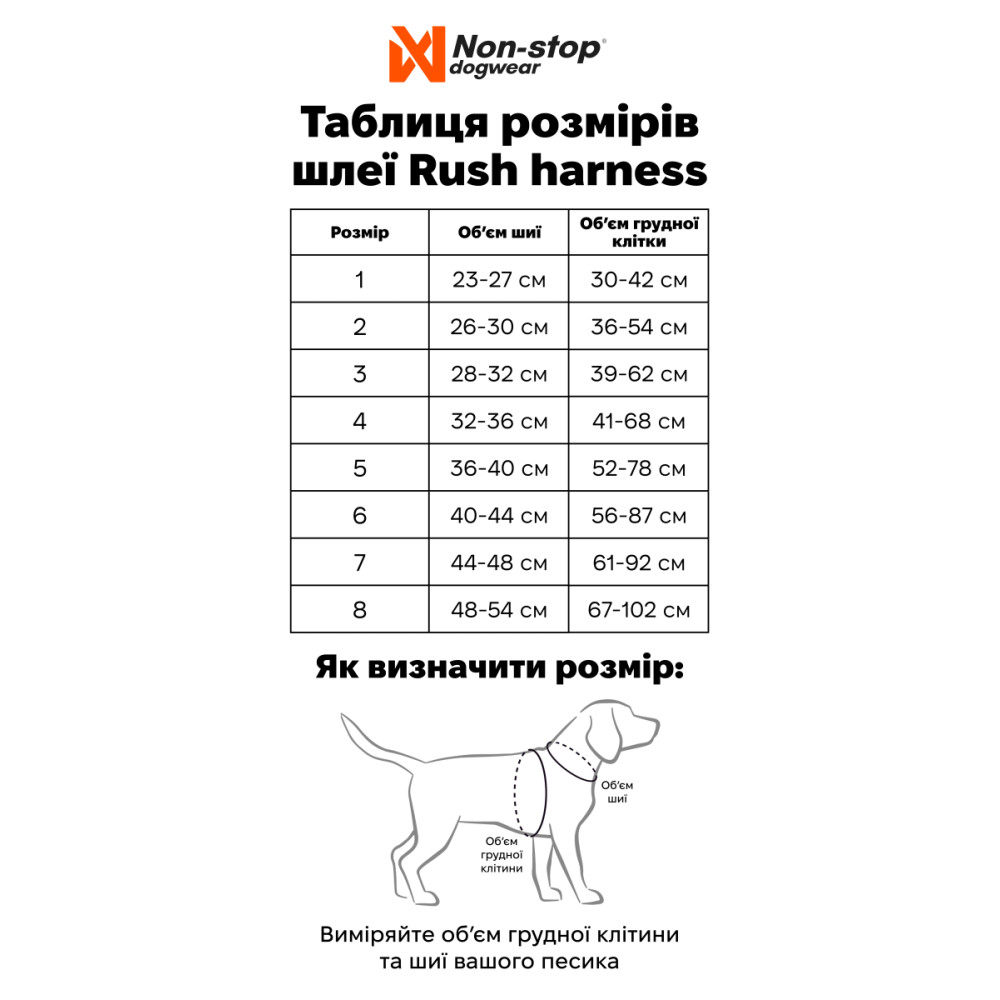 Шлейка Non-stop dogwear Rush harness має широкий розмірний ряд та регульовані ремені, тому підходить для більшості порід — від малих до великих. Головне — правильно підібрати розмір за об'ємом шиї та грудної клітки.