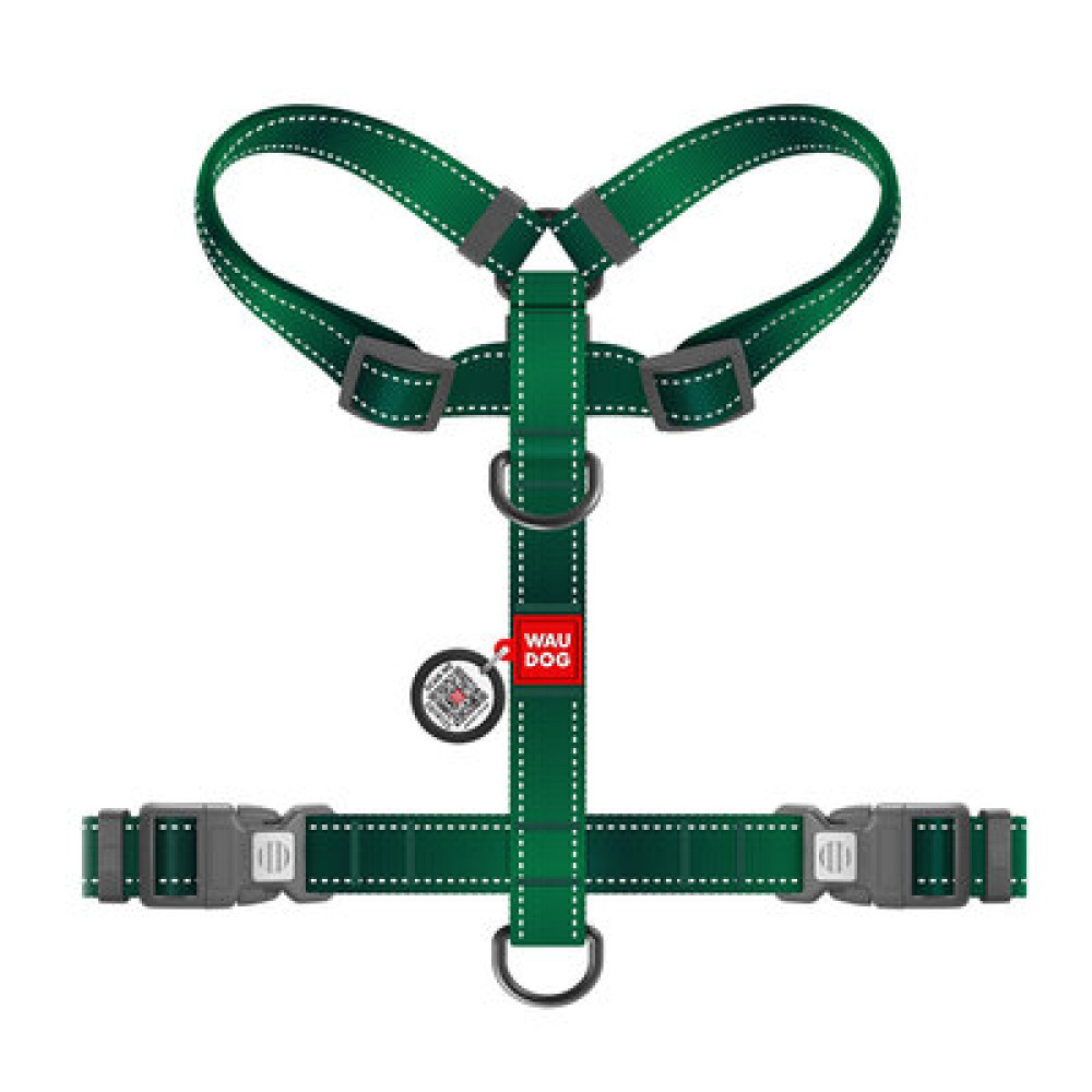 Практична та стильна Н-подібна шлея серії WAUDOG Nylon Mono у насиченому зеленому кольорі — ідеальний вибір для любителів прогулянок на природі. Амуніція виготовлена з високоякісного нейлону та гарантує безпеку вашого улюбленця 24/7: вдень радує око приємним кольором, увечері працює вплетена світловідбивна нитка, а в повній темряві орієнтиром слугує світлонакопичувальний елемент на застібці.