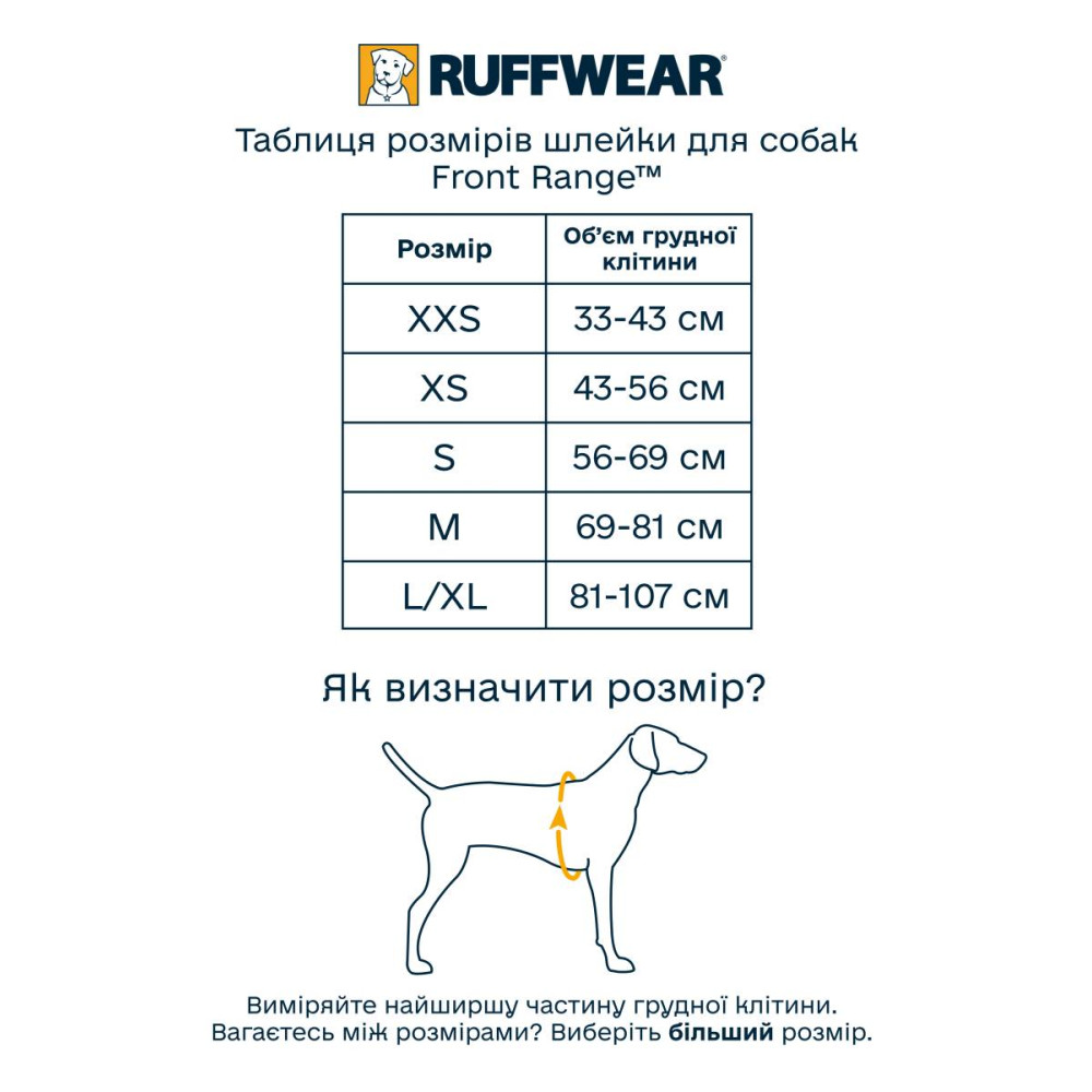 Як правильно підібрати розмір шлейки Ruffwear Front Range?Для вибору правильного розміру виміряйте обхват грудей собаки в найширшому місці, одразу за передніми лапами. Звірте отримані дані з розмірною сіткою бренду, щоб знайти оптимальний варіант.