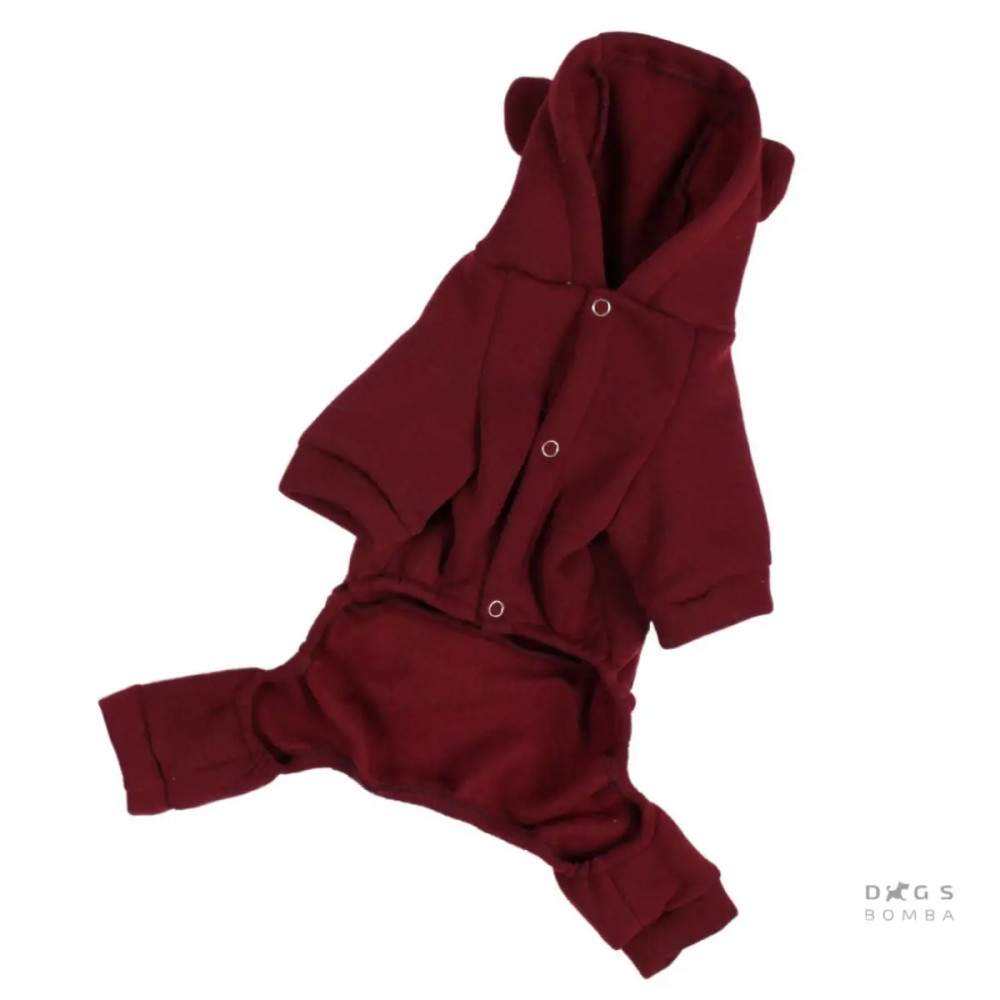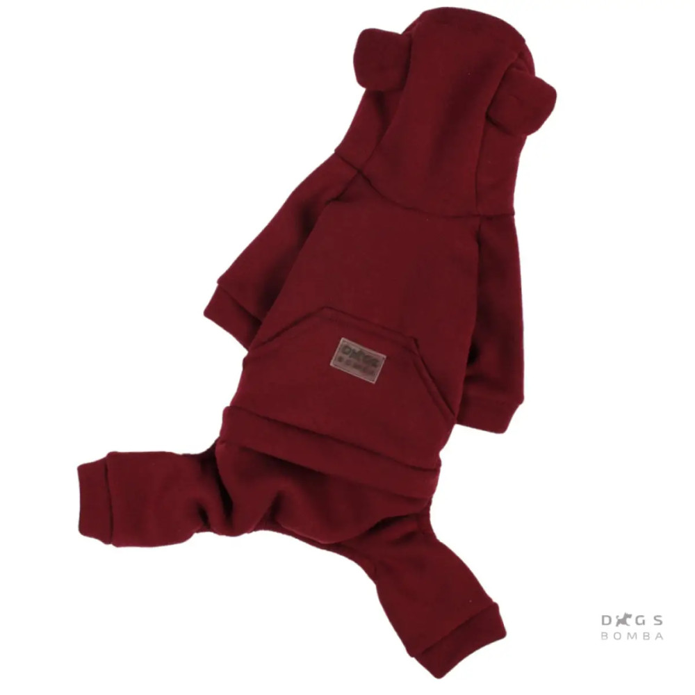 Теплий костюм для собак Dogs Bomba D-107 у кольорі марсала створений для комфортних прогулянок у прохолодну пору року. М’яка трьохнитка з начосом утримує тепло, не обмежує рухів і приємно прилягає до тіла собаки. Стильна кишеня на спині з фірмовим значком додає модного акценту, а капюшон захищає від вітру.