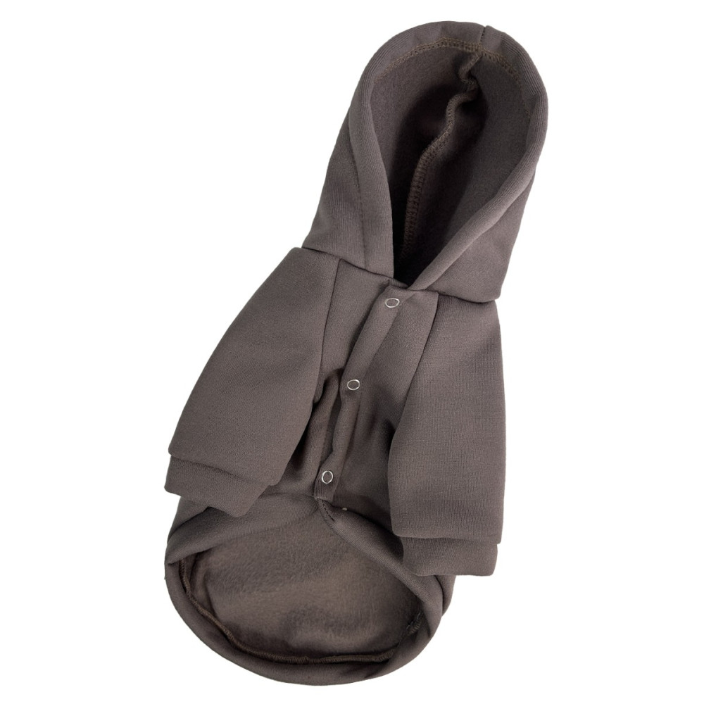 Толстовка для собак Dogs Bomba Y-368 виготовлена з щільної тканини тринитка з начосом благородного шоколадного кольору. Модель має накладну кишеню на спинці, зручний капюшон та застібається на кнопки на животі. Відмінний варіант для дому, прохолодної весни або сухої осені. Взимку рекомендуємо використовувати як додатковий шар під зимові комбінезони для собак.
