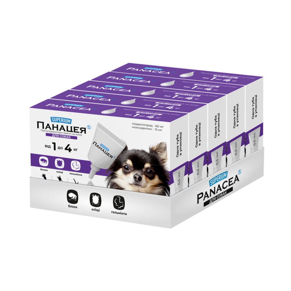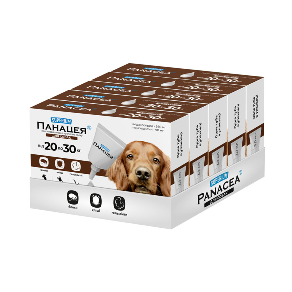 Протипаразитарні краплі для собак SUPERIUM Панацея забезпечують надійний захист вашого улюбленця від широкого спектру паразитів протягом 30 діб. Ефективні для лікування та профілактики при ураженні кліщами, блохами, вошами, волосоїдами та гельмінтами (нематодами).