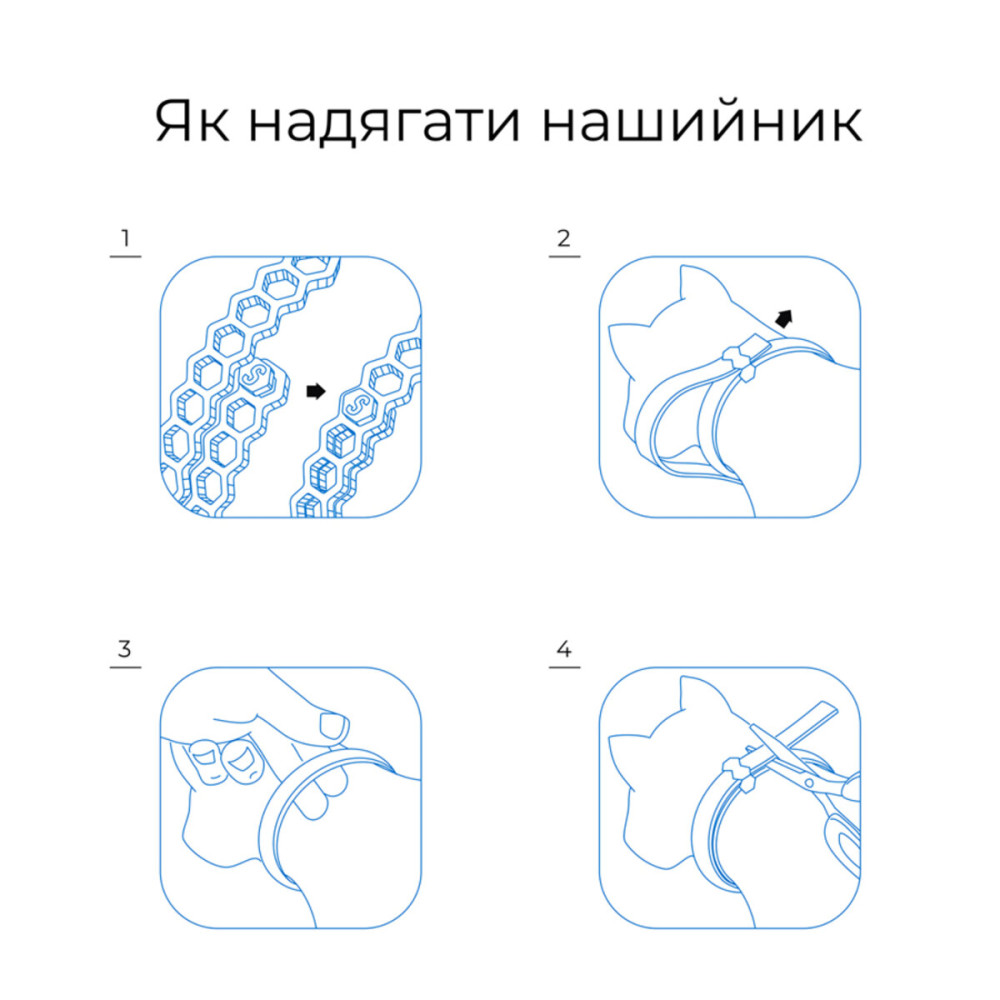 Вийміть нашийник з упаковки та одягніть його на шию тварини, закріпивши таким чином, щоб між шиєю та нашийником залишався невеликий проміжок (1-2 пальці). Залишок стрічки відріжте, враховуючи розмір тварини.