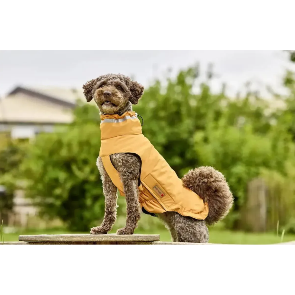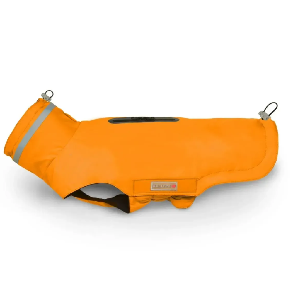 Wolters Modern Classic — помаранчева попона-дощовик для собак із посиленою погодозахистою та продуманою посадкою. Зовнішній поліестер легко чиститься, усередині — м’який фліс для базового тепла. На шиї — дуже широкий високий комір зі світловідбивною смугою для помітності у сутінках.