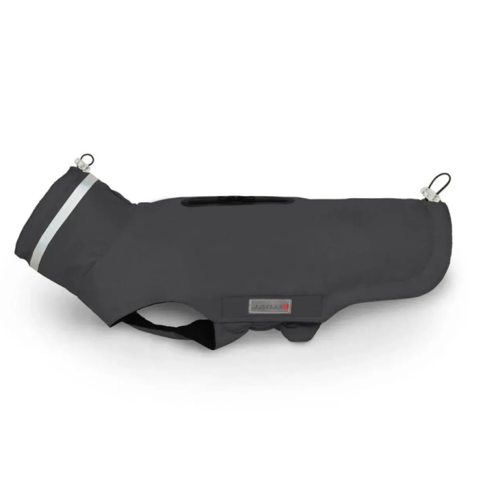 Wolters Modern Classic — темно-сіра попона-дощовик для собак із продуманою посадкою та високим рівнем захисту від негоди. Зовнішній поліестер легко чиститься, усередині — м’який фліс для базового тепла. На шиї — широкий високий комір зі світловідбивною смужкою для кращої видимості у сутінках.