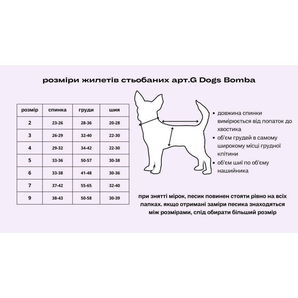 Для точного підбору розміру необхідно виміряти довжину спини (від холки до хвоста) та обхват грудей собаки. Порівняйте отримані дані з таблицею розмірів або зверніться до консультантів нашого магазину.